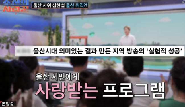 다만 녹화 후, 아내 허락 없이 친구들을 불러 모임을 가진 사실이 드러나면서 결혼 5개월 만에 ‘대형사고’를 치는 모습도 보였다. 앞으로 ‘울산사위’로서 지역 방송 MC로 자리매김할 심현섭의 도전에 관심이 쏠린다.