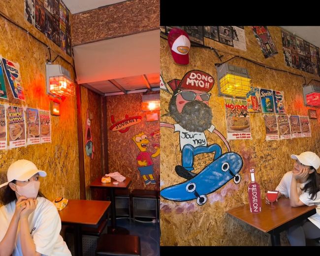 빈티지한 소품 가득한 상점 앞에서 호기심 어린 눈빛을 보내거나, 오래된 전화기를 귀에 대며 장난스러운 표정을 짓는 모습이 담겼다. 복고풍 벽화가 있는 작은 카페에서는 와인잔을 들고 미소를 지으며 여유로운 시간을 보내기도 했다.