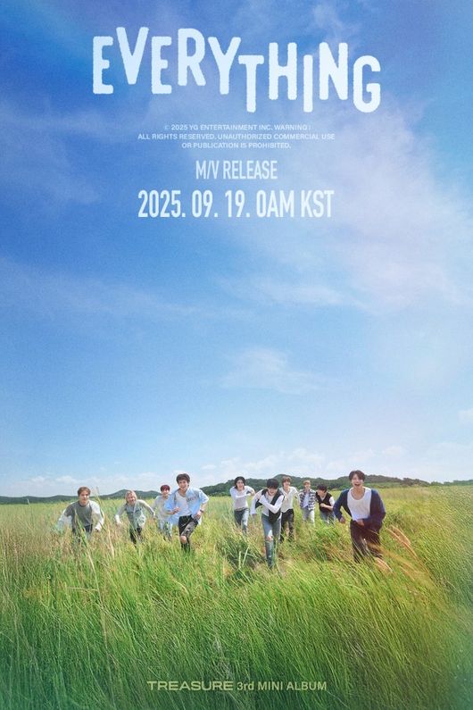 YG엔터테인먼트는 17일 공식 블로그에 'TREASURE - 'EVERYTHING' M/V TEASER POSTER'를 게재했다. 포스터에는 '2025.09.19 0AM KST'라는 공개 일정과 함께, 짙푸른 하늘 아래 들판을 달리며 환하게 웃고 있는 멤버들의 모습이 담겨 청춘의 자유롭고 밝은 무드를 완성했다.