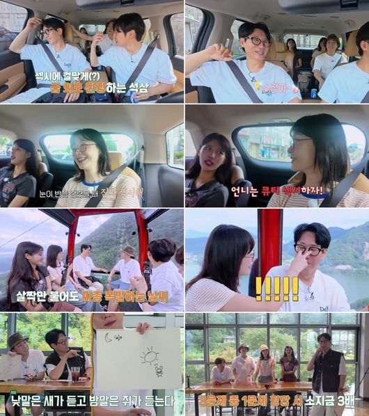 그런가 하면 한낮 시간 케이블카에 탑승하게 된 멤버 4인방과 넉살은 에어컨과 선풍기가 없는 케이블카 안에서 살짝 닿기만 해도 불쾌 지수를 폭발하며 ‘아웅다웅 케미’를 이어 나갔다. 이후 더위에 지친 이들은 ‘딱밤’ 벌칙을 걸고 ‘말하지 않기 게임’을 즉석 진행했다. 이른바 ‘침묵의 케이블카’에서, 4인방과 넉살은 서로에게 딱밤을 때려보겠다는 일념으로 최선을 다한 도발에 나서 연신 웃음을 자아냈다. 이와 함께 경비 ‘더블업’을 건 본격 미션에서는 속담과 영화 제목에 관한 ‘릴레이 그림 퀴즈’를 진행하기도 했는데, 멤버들의 ‘정답 행진’에 조급해진 제작진은 ‘경비 세 배 지급’을 걸고 더욱 큰 판을 벌여 ‘꿀잼 폭격’을 이어 나갔다.