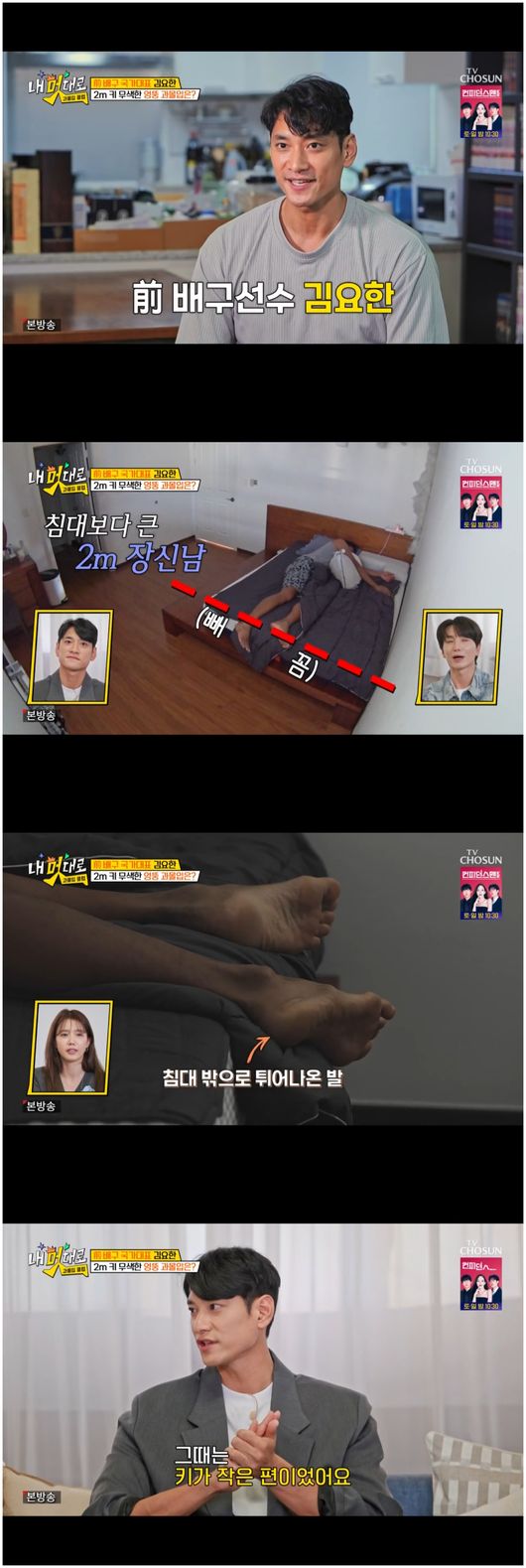 김요한은 유독 아침 스트레칭에 공을 들이는 느낌이었다. 김요한은 “자다 보면 발이 침대 밖으로 나간다. 그러면 피가 쏠린다. 그래서 피로감이 더 있다. 그래서 스트레칭을 하고 시작하면 개운한 게 다르다”라고 말했다. 기성품인 침대가 안 맞을 정도로 키가 큰 그의 일상은 조금 불편해 보였다.