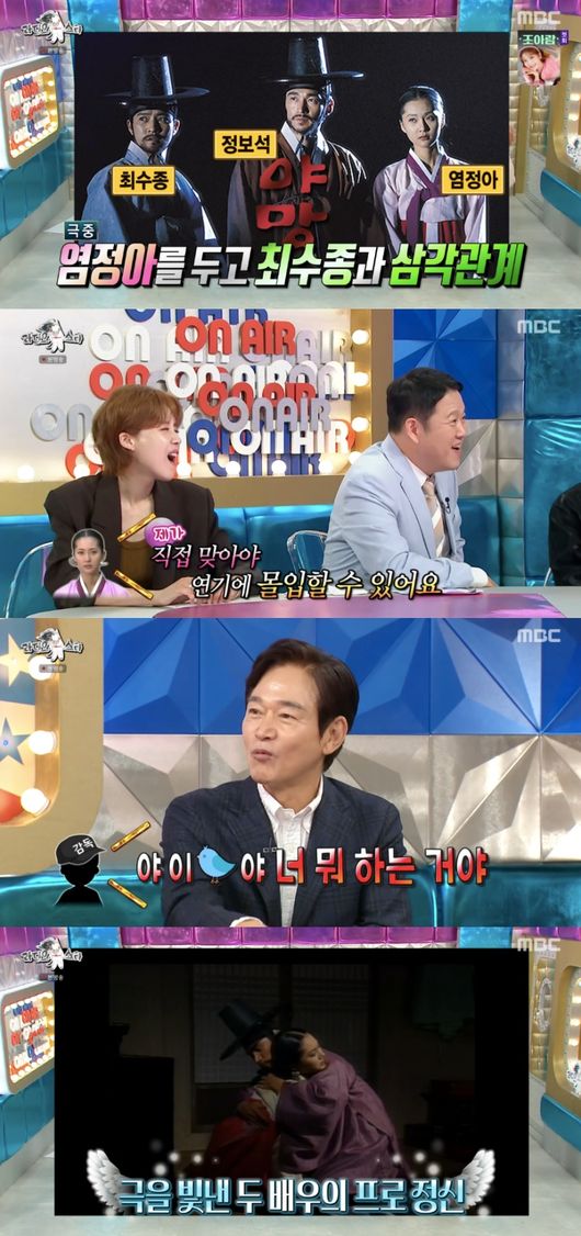 염정아와 실랑이를 벌였던 정보석은 “저는 계속 그럴 수 없다고 하는데 저를 쫓아다니면서 ‘뺨을 때려달라’고 하더라. 그래서 촬영 때 진짜로 때렸다. 저는 조절한다고 했는데 염정아 씨가 뺨 한대 맞고 쓰러졌다”라고 밝혔다.