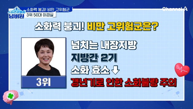 이날 이경실은 출연진들 중 소화불량성 비만 고위험군 3위에 등극했다. 검사 결과 이경실은 넘치는 내장지방과 지방간 2기, 소화효소 저하와 갱년기로 인한 소화불량이 있다고.