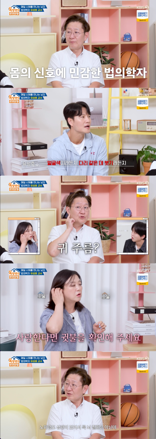 유성호 교수는 "사람들을 보면 얼굴색, 다리 부기, 그리고 귀 주름을 살피게 된다"고 밝혔다. 유성호는 이 세 가지가 몸의 중요한 건강 신호라고 설명하며, “노화와도 상관이 있어서 꼭 건강이 안 좋은 건 아니다”라고 덧붙였다.