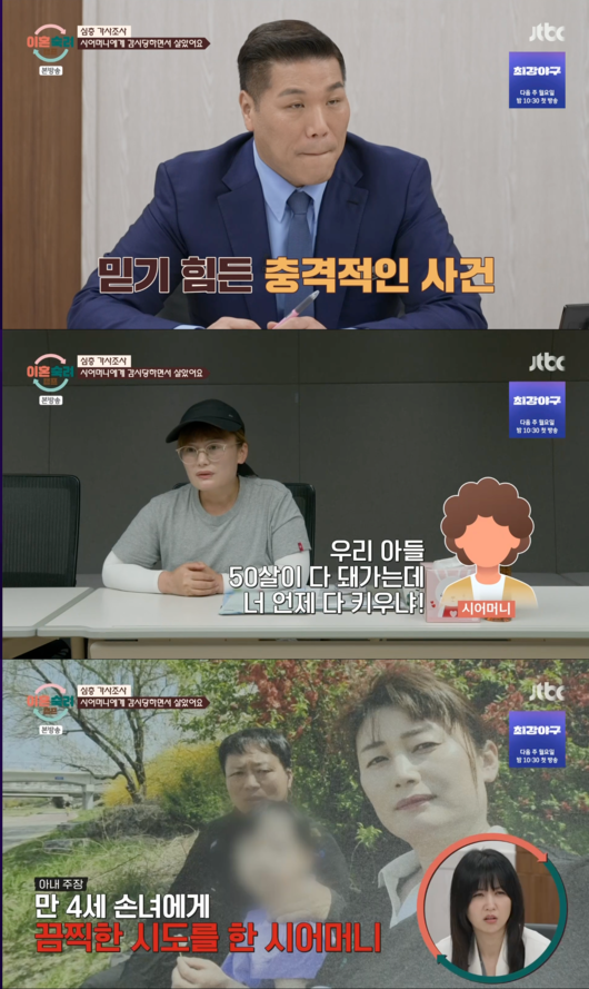 '이혼숙려캠프’ 아내가 시어머니가 4살밖에 안 된 손녀의 목을 졸랐다는 충격적인 일화를 공개했다.
