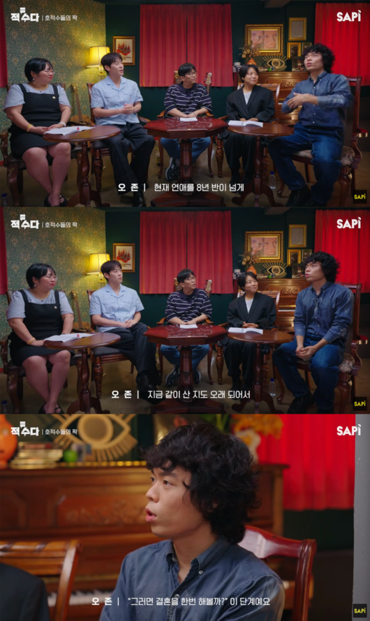실제로 자리에 있던 유부남 존박이나 유부녀 정신 작가보다도 만난 기간이 오래됐던 것. 오존은 “지금 같이 산 지도 오래 되어서, 이정도면 주변에서도 거의 사실혼이다라고 말을 해주신다”며 “그게 결혼을 하고, 안 하고의 차이가 동거랑 크다고 하시더라. 저희는 그게 궁금해서 ‘그러면 결혼을 한번 해볼까?’ 이 단계다. 구체적인 이야기는 많이 나오지 않았지만”이라고 설명했다.