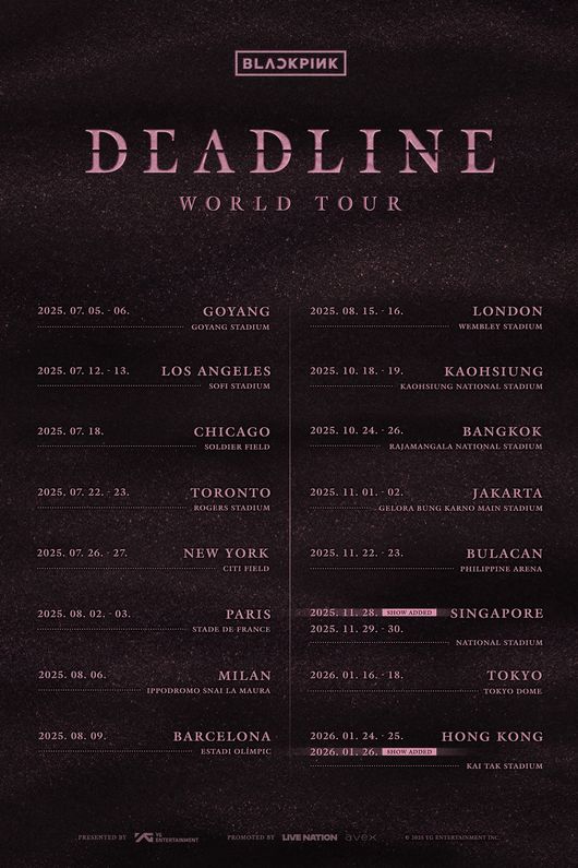19일 YG엔터테인먼트는 블랙핑크 공식 SNS에 'BLACKPINK WORLD TOUR ' 포스터를 게재했다. 이에 따르면 블랙핑크는 오는 11월 28일 싱가포르, 내년 1월 26일 홍콩 공연을 추가 개최하며 두 지역에서 총 6회에 걸쳐 현지 팬들과 만난다.