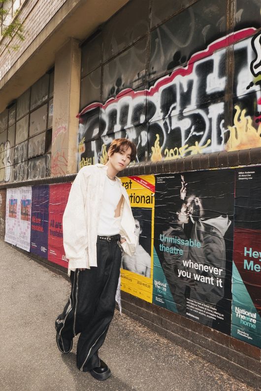 두 번째 콘셉트 포토에서는 힙하고 자유분방한 무드가 돋보였다. 낡은 건물 외벽의 그래피티와 벽보가 가득한 골목길을 배경으로, 윤서빈은 한층 시크하고 개성 있는 모습을 연출했다. 흰색 티셔츠와 루즈핏 셔츠, 그리고 와이드 팬츠를 매치한 스타일링은 그의 트렌디한 감각을 드러내며, 무심한 듯하면서도 강렬한 눈빛과 포즈는 팬들의 마음을 사로잡았다.
