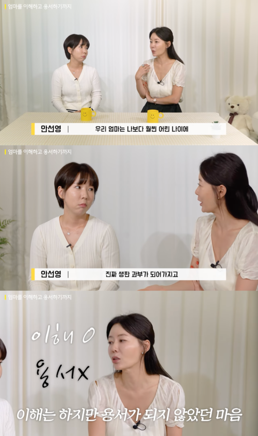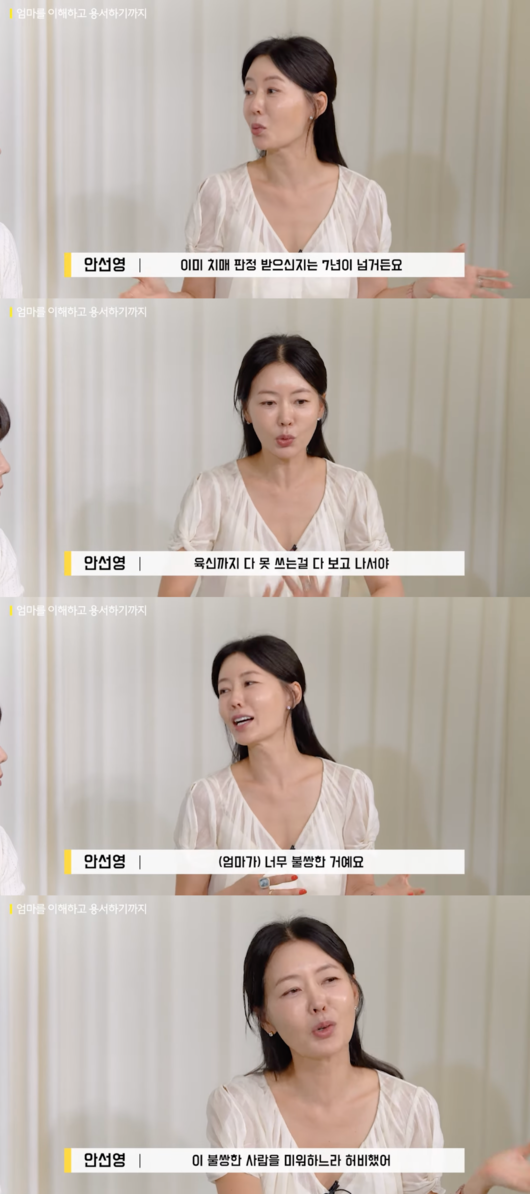 그러나 안선영은 작년에 엄마를 용서했다며 “엄마가 치매 판정을 받은 지 7년이 넘었다. 빨리 용서했으면 쉬웠을텐데, 작년에 뇌졸중으로 내 눈앞에서 쓰러졌다”고 밝혔다.