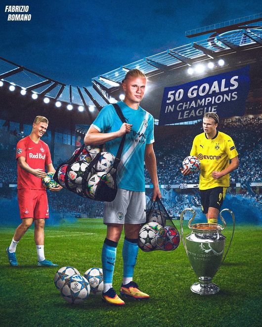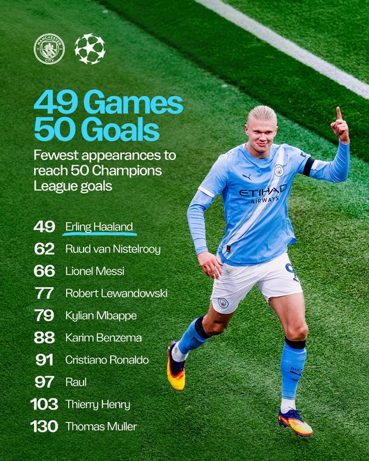 맨시티는 "홀란은 50골을 넣기까지 112경기가 걸렸던 앙리와 동률을 이루고 있다. 경기당 1골 이상을 기록 중인 그의 기록은 역대 득점 순위 50위 이내에 있는 그 어떤 선수들보다 훨씬 뛰어나다. 홀란은 UCL에서 맨시티 소속으로 27골, 도르트문트에서 15골, 잘츠부르크에서 8골을 기록했다"라고 전했다.