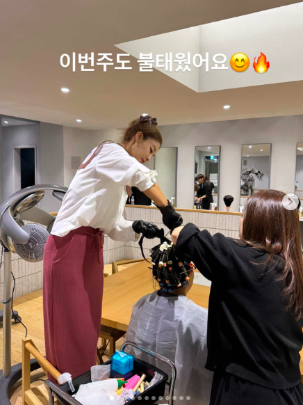사진 속 이지현은 의자 위에 올라가 고객의 머리카락에 헤어롤을 마는 열정을 드러냈다. 특히 그는 직접 머리를 자르는 모습까지 선보이며 미용사로서의 수준급 실력을 발휘해 눈길을 끌었다.