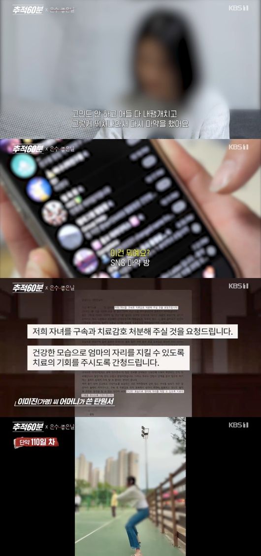 어머니는 “처음에는 병원에 가자. 가서 치료를 받자고 해서 데리고 갔었는데 병원에 입원헀다 퇴원했다가 4번 반복했다. 그게 반복이 되니까 아예 자포자기 하게 됐다. 그냥 일상생활이 다 무너진다고 보면 된다. 일단 모든 생각의 중심이 약에 있기 때문에”라고 토로했다.