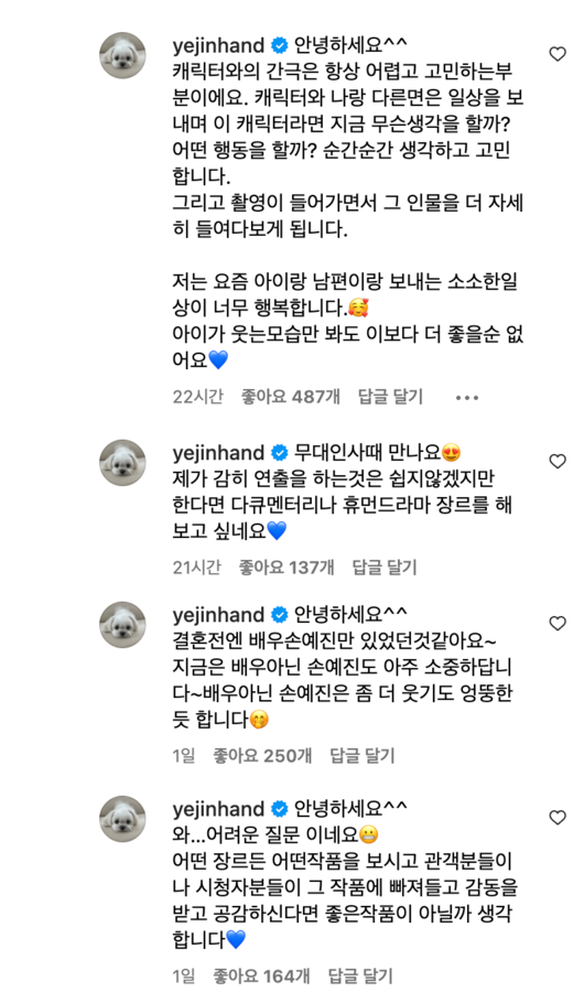 손예진이 직접 댓글을 남기자, 팬들의 질문이 쏟아졌다. 또 다른 팬은 “만약 감독이 되신다면 어떤 장르의 작품을 연출해보고 싶나요? 또 요즘 제작환경 속에서 직접 연출을 해보고 싶은 생각도 있으신지 궁금하다”고 질문하자, 손예진은 “제가 감히 연출을 하는것은 쉽지않겠지만 한다면 다큐멘터리나 휴먼드라마 장르를 해보고 싶네요”라고 말했다.