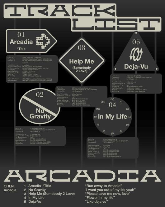 이번 앨범에는 동명의 타이틀곡 ‘Arcadia’를 비롯해 ‘No Gravity(노 그래비티)’, ‘Help Me (Somebody 2 Love)(헬프 미 썸바디 투 러브)’, ‘In My Life(인 마이 라이프)’, ‘Deja-Vu(데자뷰)’까지 총 5개의 트랙이 수록됐다. 특히, 타이틀곡과 ‘Help Me (Somebody 2 Love)’에는 첸이 직접 작사에 참여해 의미를 더했다.