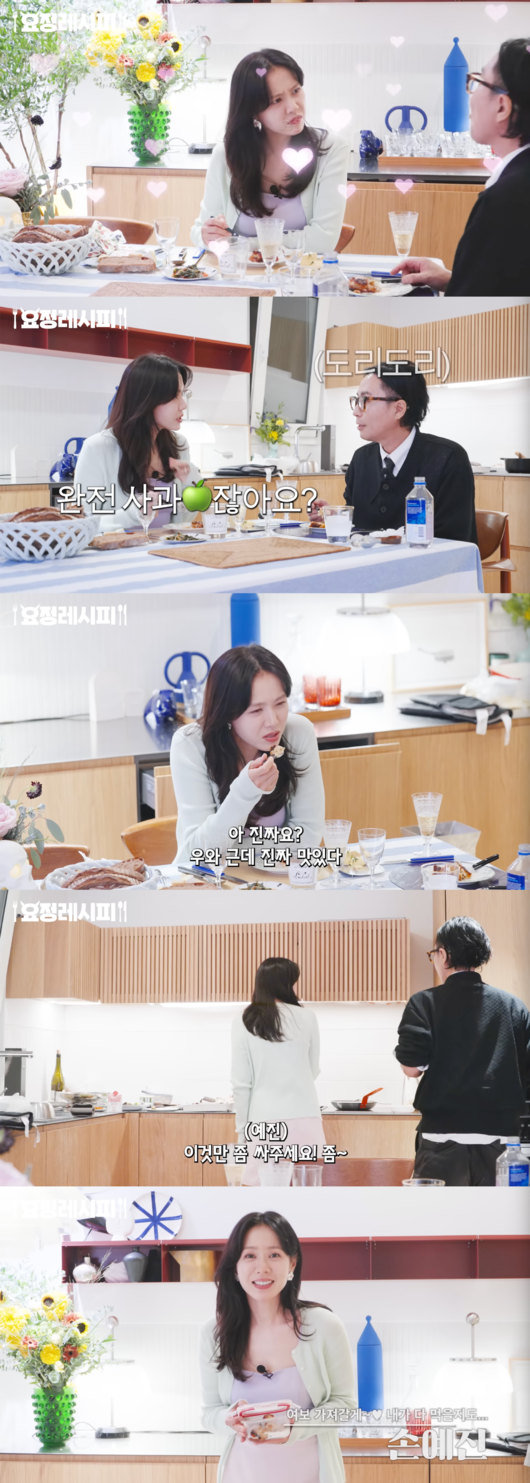 손예진은 “사과잼을 넣은 건 아니잖아요. 완전 사과잖아요. 그럼 살 안찌잖아요”라고 했고, 정재형은 “네가 레시피를 안 봤으면 좋겠다”며 웃었다.