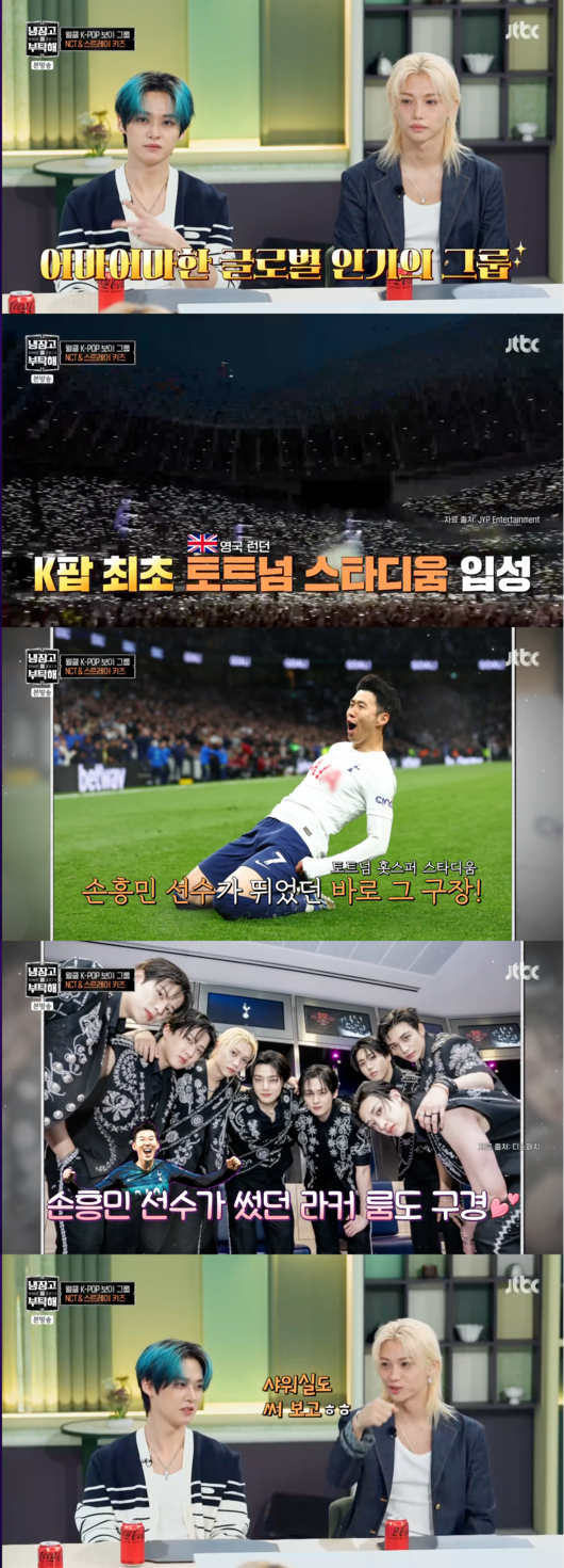 스키즈는 잉글랜드 프리미어리그 토트넘 홋스퍼 스타디움에서 케이팝 가수 최초로 공연을 했다고. 필릭스는 "손흥민 선수가 뛰었던 곳에서 공연하게 되어 영광스러웠다"며 감격스러운 마음을 드러냈다. 이어 필릭스는 “선수들이 사용했던 샤워실도 써보고, 물만 손만 닦고 다시 놨다"고 말하며 웃음을 자아냈다.
