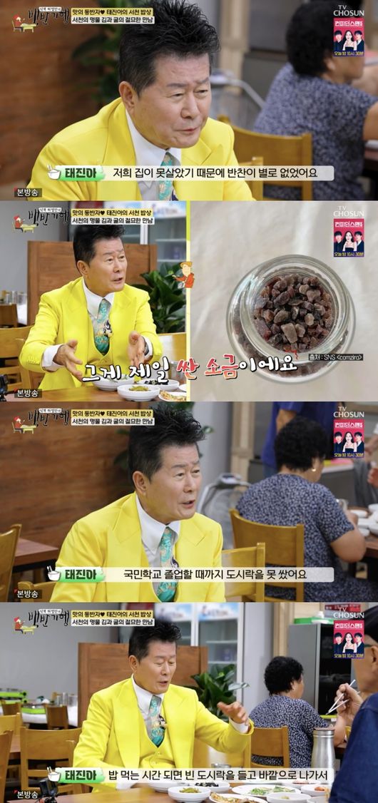 태진아는 “저희 집이 못살았기 때문에 반찬이 별로 없었다. 도토리가 나는 가을이 되면 산에 가서 도토리를 많이 따서 온다. 그래서 그걸로 도토리묵을 만들었다. 양념이 많이 들어가야하는데 없다. 그냥 자반고등어 보면 굵은소금 시커먼 거 있지 않나. 그게 제일 싼 소금이다. 그거 물에 타서 그 위에 뿌렸다. 그렇게 먹었다”라고 가난했던 어린시절을 떠올렸다.