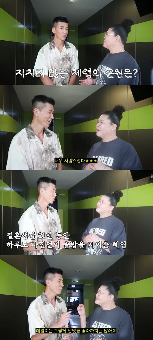 이에 이영자는 "결혼 21년차인데 사랑이 식지 않는 이유가 뭐냐"고 물었고, 션은 "너무 사랑스럽다"며 "혜영이가 21년 동안 솥밥을 해줬다"고 말해 놀라움을 자아냈다.