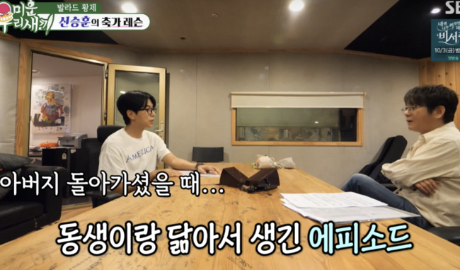 윤현민은 “사실 부탁할게 있다”며 “축가”라고 조심스럽게 입을 뗐다. 윤현민은 부모님의 이혼 후 아버지의 재혼으로 생긴 이복동생의 결혼식 축가를 맡게 됐다며, 신승훈에게 축가 티칭을 부탁던 것.
