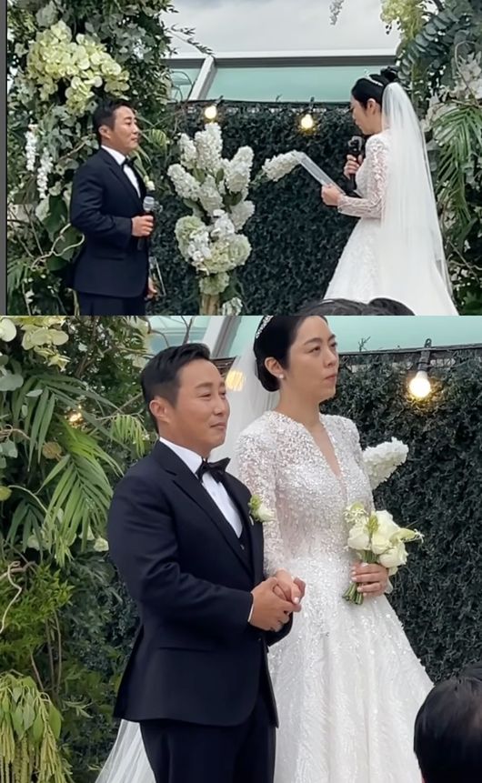 공개된 사진 속 최여진은 남편과 다정하게 포즈를 취하며 환한 미소를 지었다. 이어 공개된 영상에는 하얀 웨딩드레스를 입은 신부와 턱시도를 입은 김병만이 서로를 바라보며 서약을 나누는 모습이 담겨 보는 이들까지 뭉클하게 만들었다.