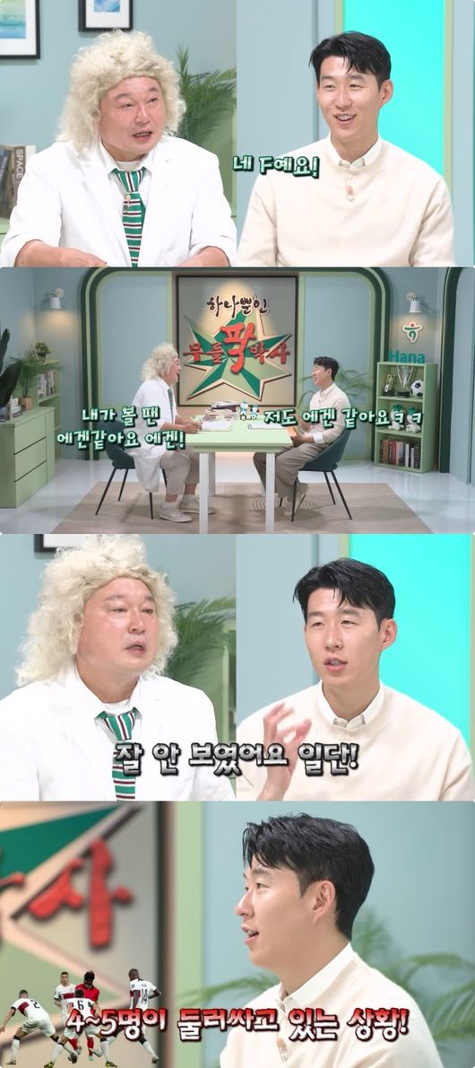 이에 강호동은 잘 우는 손흥민을 보며, “F죠? MBTI 아시네”라고 물었고, 손흥민은 “F다”라고 밝혔다. 이어 강호동은 “에겐남이냐?”라고 재차 물었고, 손흥민은 “테토남이냐?”라고 강호동에게 다시 질문했다. 강호동은 “내가 볼 때는 에겐 같다”라고 말했고, 그러자 손흥민도 “저도 에겐 같다”라며 비슷한 성향에 대해 언급해 웃음을 줬다.