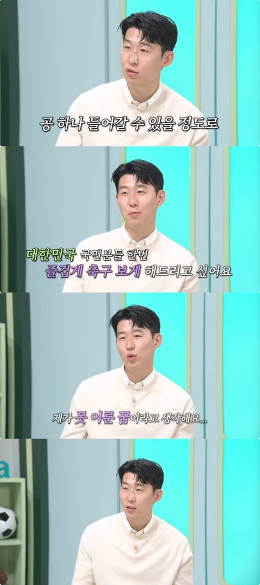 손흥민은 그의 네 번째 월드컵인 ‘2016 북중미 월드컵’에 대해서 “대한민국을 대표해서 네 번이나 나갈 수 있다는 것은 말로 표현할 수 없다. 즐기긴 어려운데 즐겨보고 싶다. 대한민국 국민들 즐겁게 축구 보게 해드리고 싶다. 그게 대표팀으로서 제가 아직 못 이룬 꿈이라고 생각한다. 아직 다 이루지 못한 꿈”이라고 말해 눈길을 끌었다. /seon@osen.co.kr