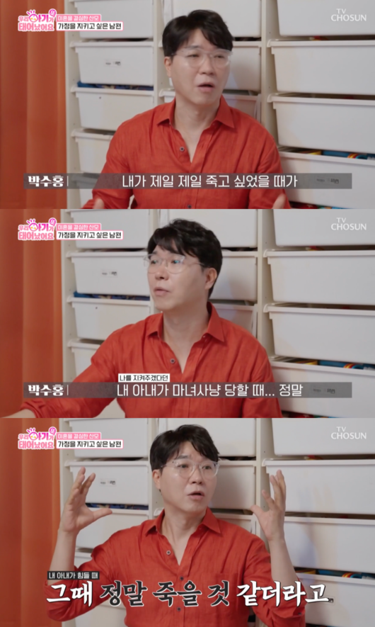 박수홍은 자신의 경험도 털어놓았다. 그는 “내가 죽고 싶었던 순간은 나 때문에, 날 지켜주겠다는 아내가 전국민에게 마녀사냥을 당했을 때였다. 모두가 비난할 때 너무 힘들었다”며 “그래서 나는 집에 들어갈 때마다 아내가 지치지 않도록 휴대폰을 내려놓고 바로 올라간다. 그게 남편이 해야 할 일”이라고 고백했다.