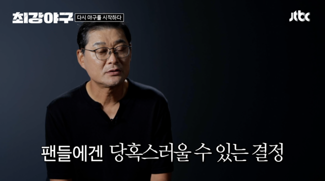 지난 22일 방송된 ‘최강야구’에서 이종범 감독은 제작진과의 인터뷰를 통해 “조금 힘든 시간을 보냈다. 쉽지 않은 결정이었다”며 솔직한 심경을 밝혔다. 그는 “프로야구에 몸담은 지 32년이 됐는데, 갑작스럽게 다른 방향으로 흘러가면서 실망한 분들도 있었을 것 같다. 그 점에 대해 죄송하다”고 고개를 숙였다.