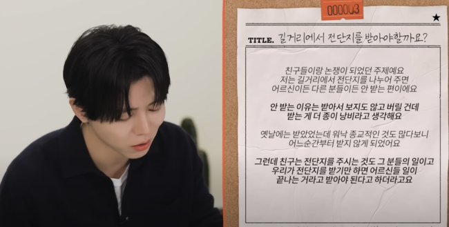 영상의 사연자는 “전단지를 받지 않는다. 받아서 보지도 않고 버릴 건데 종이 낭비라 생각해서”라며 “옛날엔 받았지만 종교적 내용도 많아져서 받지 않게 됐다”고 고백했다. 반면 친구는 “전단지를 받으면 그분들의 일이 끝난다”라며 받는 쪽을 옹호했다.