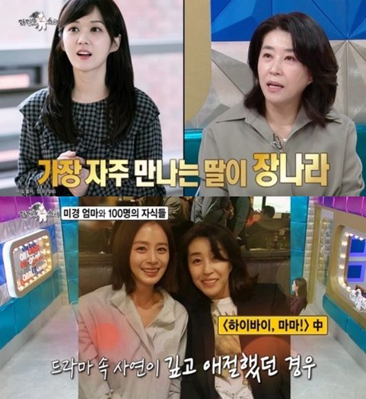 ‘라디오스타’에 출연한 ‘대한민국 스타들의 엄마’ 배우 김미경이 작품 속에서 만난 100명이 넘는 자식들 중 유독 애정이 가는 딸로 장나라와 김태희를 꼽아 눈길을 모은다. 그는 작품이 끝난 후에도 실제 모녀처럼 지내는 에피소드를 전해 관심을 모은다.