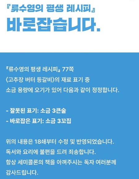 해당 공지문은 류수영의 저서 '류수영의 평생 레시피' 속 재료 표기 오류를 수정했다는 내용이다.
