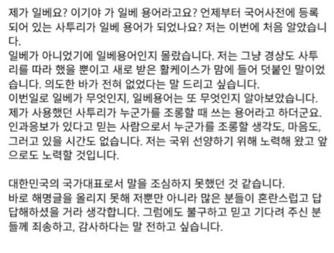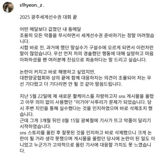 임시현은 23일 자신의 SNS를 통해 사과했다. 임시현은 “대한민국의 국가대표로서 말을 조심하지 못했던 것 같습니다. 바로 해명글을 올리지 못해 저뿐만 아니라 많은 분들이 혼란스럽고 답답하셨을 거라 생각합니다. 믿고 기다려주신 부들께 죄송하고 감사하다는 말 전하고 싶습니다”라고 고개를 숙였다.