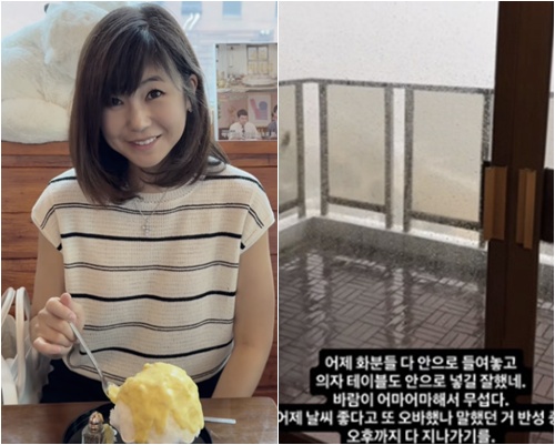 강수정은 "어제 화분들 다 안으로 들여 놓고 의자 테이블도 안으로 넣길 잘했네"라면서 "바람이 어마어마해서 무섭다"고 했다.