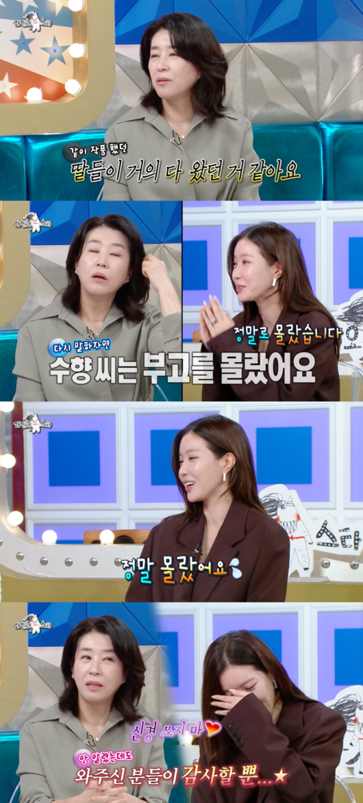 지난해 모친상을 당했다고 고백한 김미경은 “부고 문자를 따로 보내지 않았는데 기사가 나면서 너무 많은 분들이 조문을 와주셨다. 드라마 딸들도 거의 다 찾아와줘서 큰 위로가 됐다”고 회상했다. 이에 MC들이 임수향을 지목하자, 임수향은 “정말 몰랐다”며 당황해 했다. 김미경은 “수향이는 부고를 못 받아서 못 온 것뿐”이라며 따뜻하게 감싸 훈훈함을 더했다.