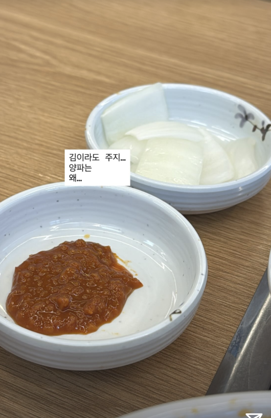 이어진 게시물에는 김치찜과 김치 반찬만 가득한 식판을 찍으며 “김치찜에 김치 반찬, 먹을 게 김치밖에 없음…”이라고 적었고, 양파와 고추장만 놓인 밑반찬 사진에는 “김이라도 주지… 양파는 왜…”라며 아쉬움을 토로했다.