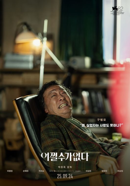 '어쩔수가없다'는 '다 이루었다'고 느낄 만큼 삶이 만족스러웠던 회사원 만수(이병헌)가 덜컥 해고된 후, 아내와 두 자식을 지키기 위해, 어렵게 장만한 집을 지켜내기 위해, 재취업을 향한 자신만의 전쟁을 준비하며 벌어지는 이야기를 담은 영화다. 박찬욱 감독의 신작이자 이병헌, 손예진 등 톱배우들과의 만남으로 하반기 최고 기대작으로 꼽히고 있다.