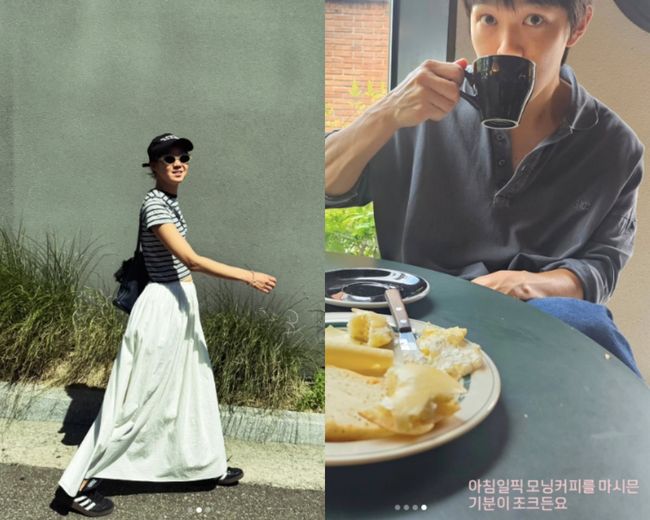 사진에는 공효진의 시선으로 담은 남편 케빈오와 반려견의 모습이 담겼다. 케빈 오는 선글라스를 착용한 채 미소 짓거나 커피를 마시며 자신을 찍는 공효진을 바라보고 있다. 이에 공효진은 “아침 일찍 모닝커피를 마시믄 기분이 조크든요”라고 글을 남겼다.