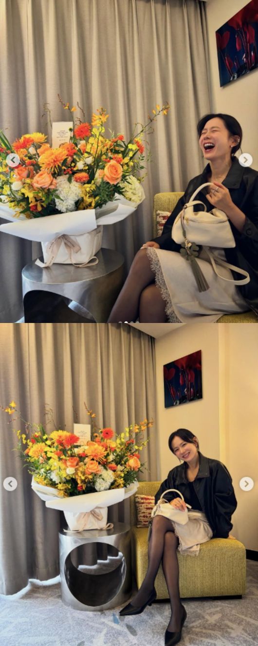 사진 속 손예진은 거대한 꽃다발을 옆에 두고 포즈를 취하고 있는 모습이 담겼다. 그는 카메라를 향해 미소를 짓는가 하면, 무언가 빵 터진 듯 털털한 매력을 선보이기도 했다.