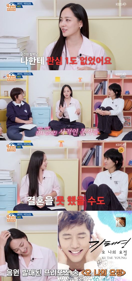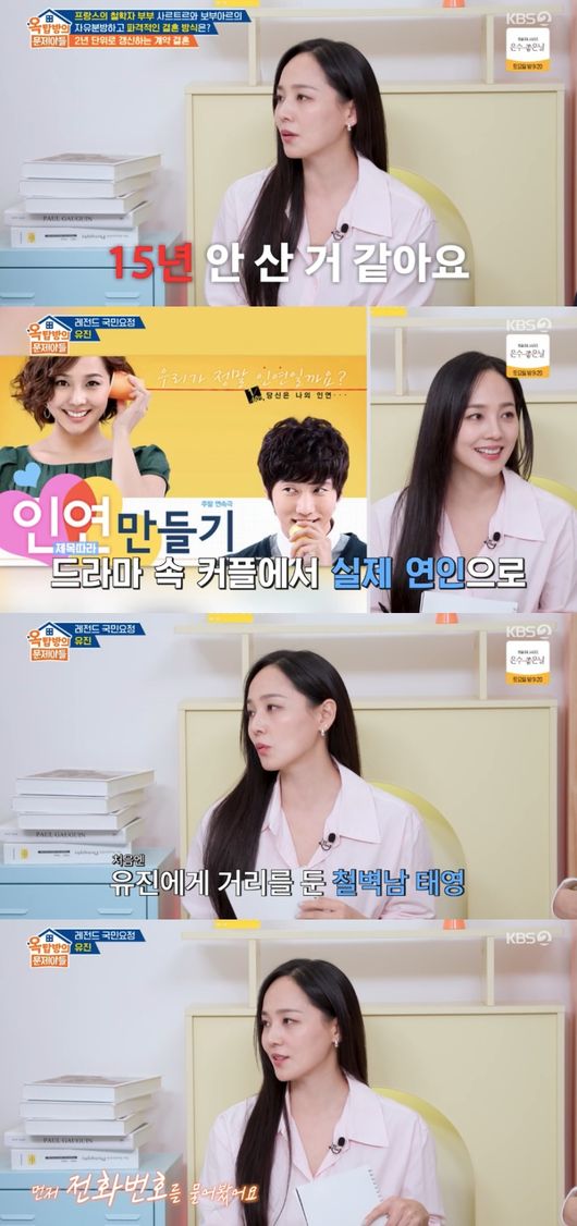 25일 방송된 KBS 2TV 예능 ‘옥탑방의 문제아들’(이하 ‘옥문아’)에서는 배우 유진이 출연해 결혼 15년 차 유진, 남편 기태영과 첫 만남부터 연애, 그리고 결혼까지 러브스토리를 공개했다.