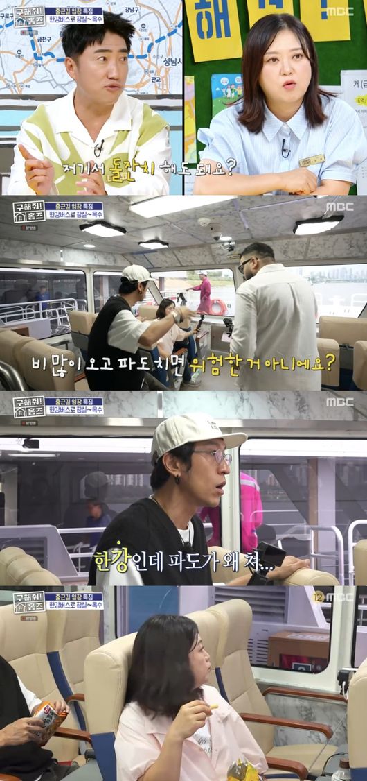 이날 김숙, 빽가, 럭키, 레오는 방송 최초 한강버스를 타고 임장지로 이동했다. 일반 교통카드를 찍고 탑승한 네 사람에 장동민은 “저기서 돌잔치 해도 되냐”라고 물었고, 박나래는 “프러포즈 해도 되냐”라고 거들었다. 이어 양세형은 “가면서 낚시 가능하냐”, 장동민은 “줄 달고 서핑해도 되냐”라고 했고, 김숙은 “안된다. 대중교통이다”라고 선을 그었다.