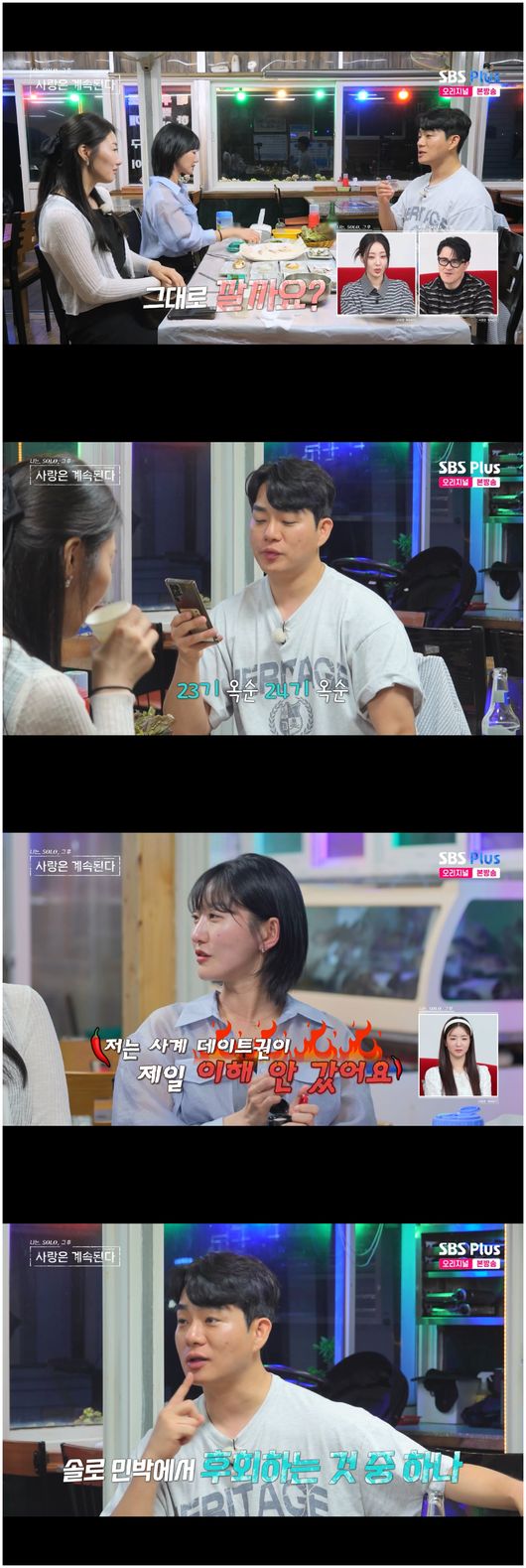 25일 방영한 ENA, SBS Plus 예능 ‘나는 SOLO, 그 후 사랑은 계속된다’(이하 ‘나솔사계’)에서는 최종 선택 전날 밤이 저물어갔다. 여성 선택 데이트가 시작되자 모든 출연자들의 표정은 기묘해졌다. 특히 남성 선택의 데이트를 기다리고 있었던 24기 옥순은 오묘한 표정이 되었다. 24기 옥순을 기다리는 미스터 제갈, 미스터 나, 미스터 김 등이 있었지만 24기 옥순은 미스터 나를 선택했다.