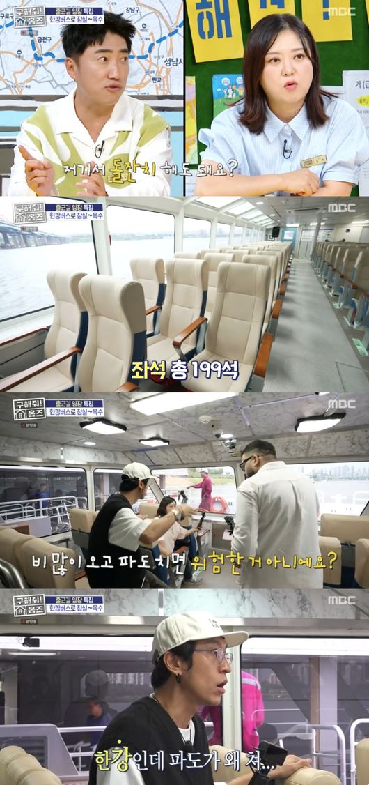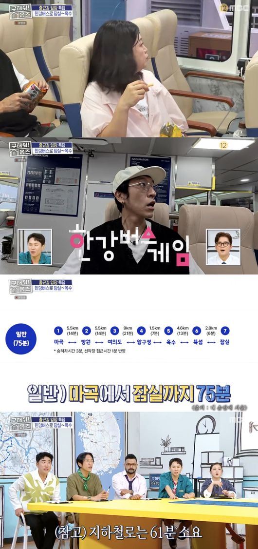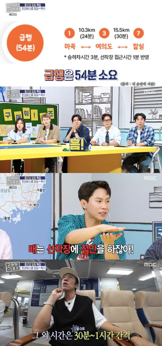 한편, 김숙은 잠실역에서 마곡역까지 소요 시간에 대해 “일반이 있고 급행이 있다. 일반은 75분 걸린다”라고 말했다. 지하철보다 많이 걸리는 시간에 빽가는 “1시간 15분이나 걸리냐”라고 했고, 김숙은 “7개 모든 선착장에 정거하다 보니까 시간이 걸린데 근데 급행이 있다. 54분 걸린다”라고 덧붙였다.