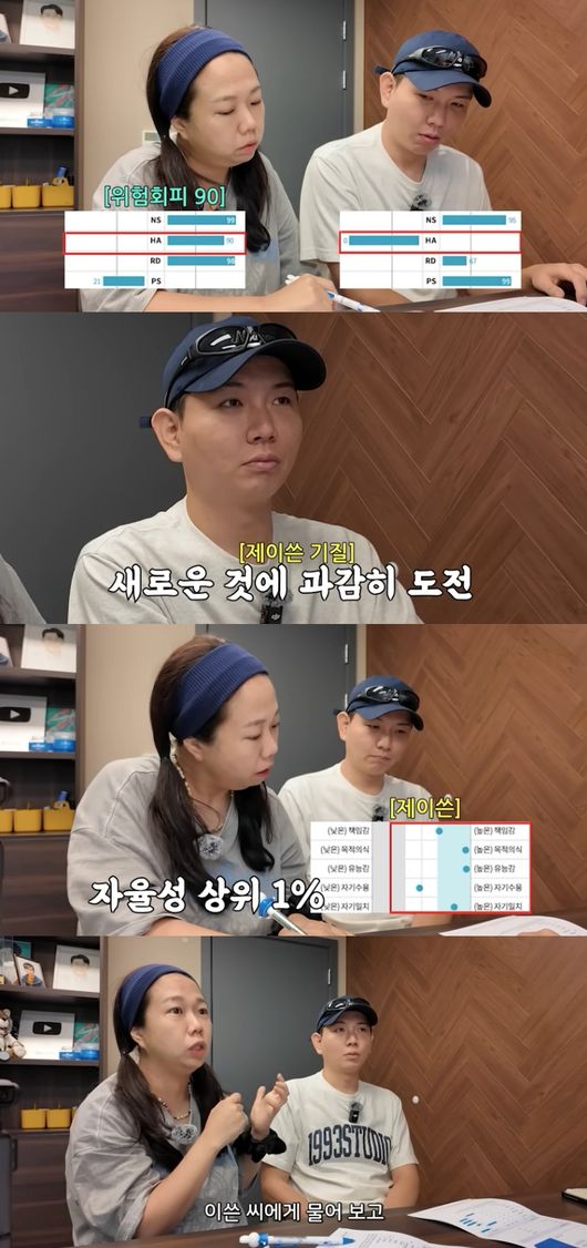 위험회피는 서로 정반대였다. 제이쓴은 없는 반면, 홍현희는 높게 나왔다. 이에 대해 전문의는 “위험회피가 높은 사람은 미래보다 현재를 조금 더 탄탄하게 해야 하는 사람이다. 새로운 걸 하고 싶으면서도 겁이 동시에 많은 사람”라며 "반대로 제이쓴은 겁을 안 내고 새로운 걸 하자고 하는데 홍현희는 불확실한 것보다 안전한 걸 좋아한다”라고 설명했다.