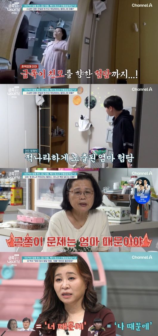 이날 할머니는 식사 도중 아빠를 불러내 금쪽이 친모에 대한 부정적인 감정을 쏟아냈다. 심지어 친모 험담을 했고, 이를 몰래 들은 금쪽이는 녹음하다 들키고 말았다. 이에 분노한 할머니는 “해도 너무한다. 너 그렇게 살지 마라”라며 나무랐다.