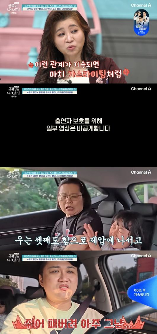 그런가 하면, 할머니는 이동하는 차 안에서 금쪽이 동생들이 시끄럽게 굴자 “조용히 해”라고 소리쳤다. 그때 둘째가 실수로 막내를 팔꿈치로 치면서 우는 상황이 발생했고, 할머니는 “하지말라면 하지마”라며 손찌검까지 해 모두를 경악하게 만들었다.