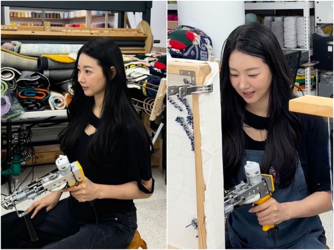 김사랑은 25일 자신의 SNS에 영상을 게재했다. 공개된 영상 속 김사랑은 작업실에서 직접 터프팅에 도전하며 진지한 표정을 짓고 있다. 블랙 티셔츠에 청색 앞치마를 두른 편안한 차림에도 불구하고, 뚜렷한 이목구비와 맑은 피부, 청순한 긴 생머리가 어우러져 눈길을 끈다.