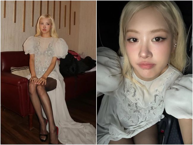 은은하게 비치는 시스루 원피스에 풍성한 퍼프 소매와 화려한 비즈 장식이 더해져 고혹적인 분위기를 자아냈다. 여기에 블랙 스타킹과 하이힐을 매치해 로제만의 세련된 카리스마를 완성했다.