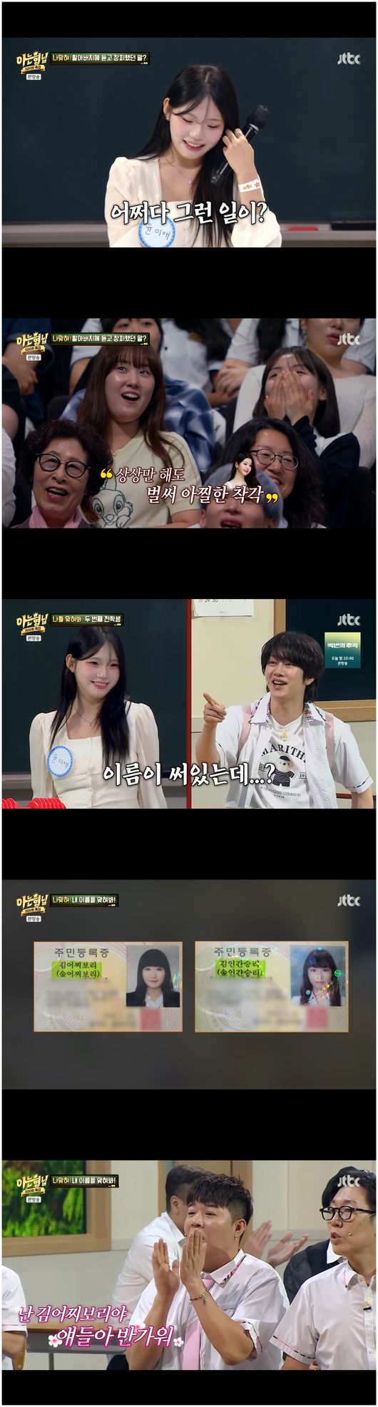 첫 번째 게스트로는 김어찌보리가 등장했다. 자신의 이름을 맞혀 보라고 한 김어찌보리는 “동생 이름은 김인간승리다. 내 이름을 이야기하자면 아빠가 이름을 고민하셨다고 한다. 산속을 걷다가 스님을 만났는데 이름을 특이하게 지어야 잘 산다고 해서 ‘어찌보리’라고 했다”라면서 “동생은 1kg도 안 된 미숙아였다. 3.2kg으로 건강하게 퇴원하면서 간호사가 ‘동생이 인간승리다’라고 해서 아버지께서 인간승리라고 지었다”라며 독특한 이름 내력을 전했다.