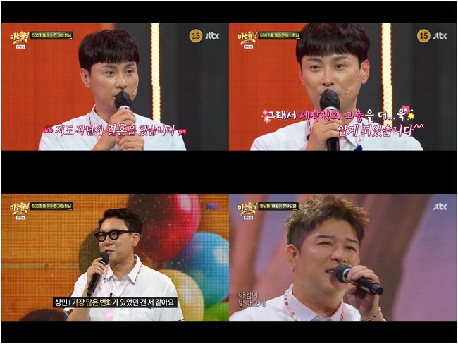 민경훈과 이상민은 '아는 형님'을 찍으면서 각각 결혼, 재혼에 성공했다. 이상민은 “여러분 덕분에 많은 변화가 있었다. 덕분에 결혼도 하게 됐다”라며 고마움을 전했다. 민경훈은 “이 방송을 만들어 주시는 제작진 분들에게 감사하다. 저도 작년에 결혼을 했는데 제작진의 고충을 더욱 알게 됐다”라면서 PD 출신 아내를 염두에 두고 사랑을 전해 시선을 끌었다.