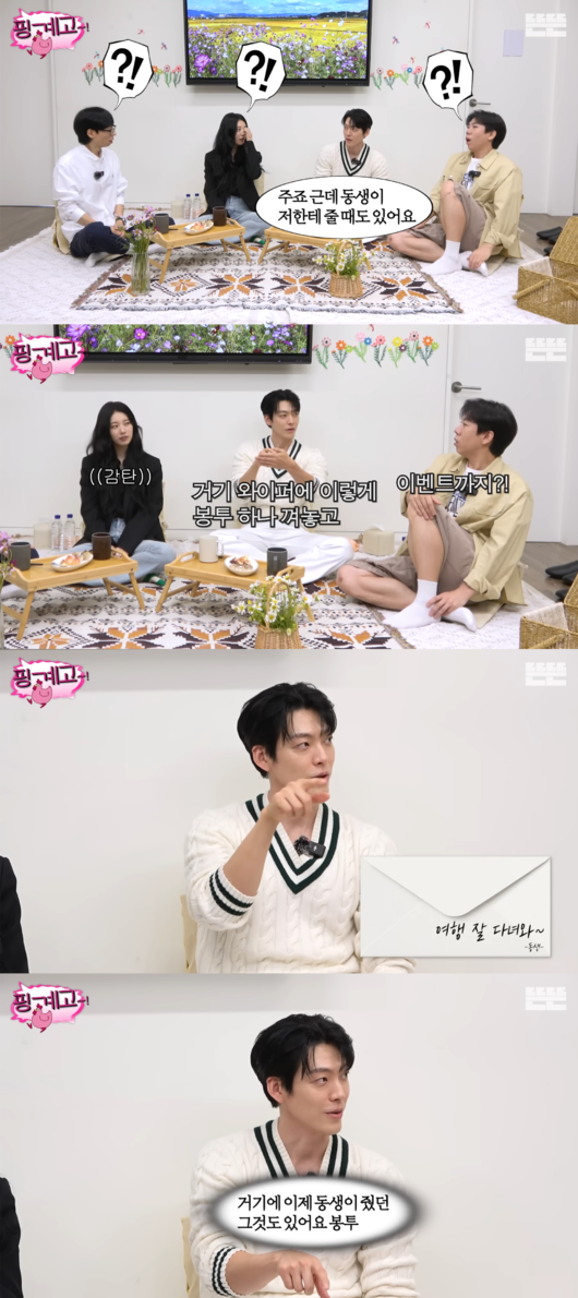 특히 김우빈은 3살 어린 여동생에 용돈을 받은 적도 있다고 밝혀 출연진을 두 번 놀라게 했다. 그는 “저도 동생한테 용돈을 주는데, 동생이 저한테 용돈을 줄 때도 있다. 저희 집에 주택인데, 대문을 열고 나가면 차가 있는데 한번은 차 와이퍼에 봉투를 끼워 놓고 갔더라. ‘여행 잘 다녀와’라고 적어놨더라”고 고백해 부러움을 샀다.